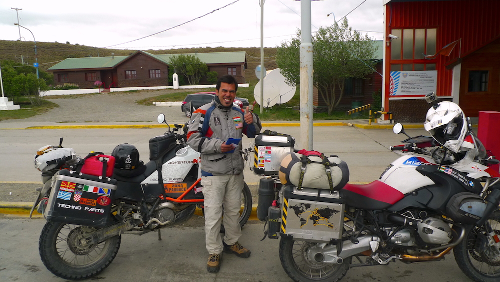 Llegando a la frontera con Argentina veo a lo lejos la silueta de una moto solitaria así que le aprieto un poco para alcanzarla. Es Nick, un estadounidense de Texas que lleva 3 años dando la vuelta al mundo en una BMW Adventure. Le viene muy bien mi asistencia para hacer todos los papeles aunque bueno, viene de dar la vuelta al mundo y sin mi ayuda lo hubiera hecho igual.