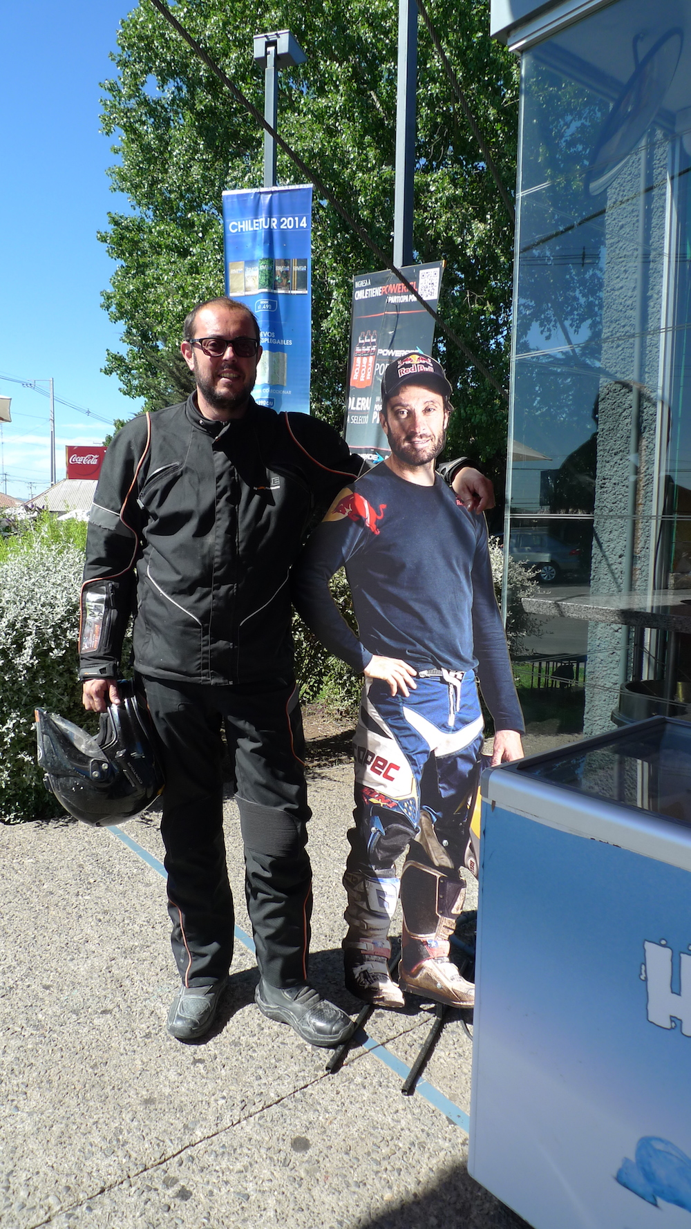 En una gasolinera de Copec me encontré con Chaleco López que está patrocinado (aquí le dicen auspiciado) por ellos y no pude evitar hacerme una foto.