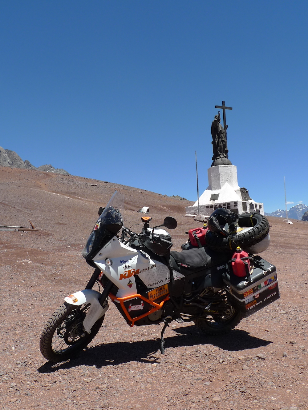 El Paso de Libertadores es el mas importante entre los dos países porque es el que mas o menos une las dos capitales. Han construido un túnel que te evita subir del todo y pasas solo a unos 3.200 metros sobre el nivel del mar. Eso sería lo normal si no eres un flipao en una KTM y decides que el túnel ese es una mariconada y que tu quieres hacer la pista original que llega al Cristo Redentor a 3.850m.s.n.m.