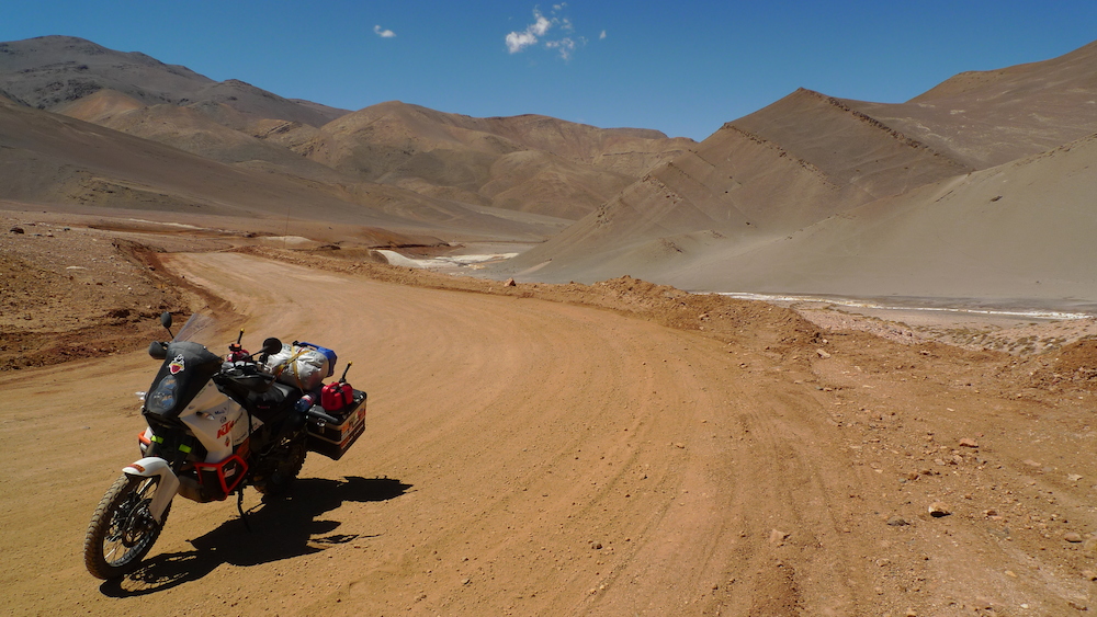 En la bajada de esa primera cumbre están reparando la pista y por tanto además de pasar la niveladora de cuchilla van regando toda la pista con sal que me pone la moto perdida con la mezcla del agua salada y la tierra.