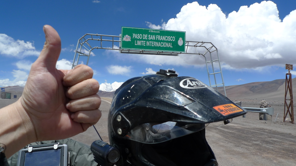 Cuando llego aparece un arco metálico con la típica señal de frontera pero indicando la altura. A un lado un pequeño monumento a San Francisco y justo del lado Argentino empieza el asfalto. Si, es la primera vez que una carretera es mejor del lado Argentino que del Chileno.
