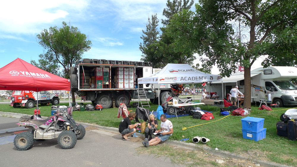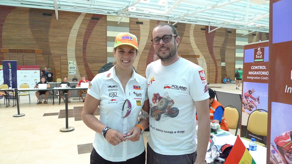 Pasamos al lado de la zona del equipo de Laia que está terminando de pintar su roadbook. Por si hay alguien que aun no sepa quien es Laia Sanz, es una joven española que ha ganado 13 campeonatos del mudo de trial, campeonatos de Europa, campeona del mundo de enduro un par de veces y ha ganado el Dakar en categoría femenina tres veces. Julián me la presenta y resulta ser encantadora. Nos cuenta que su moto ha ardido y que justo ha tenido tiempo de tirarla al suelo y apagar las llamas con arena y milagrosamente ha podido seguir la etapa. Aun así, su objetivo este año era quedar entre los 25 primeros de la general y está mosqueadísima porque se ha saltado un waypoint por seguir a un piloto teóricamente experto en lugar de seguir su instinto que le decía que era por otro lado. La han penalizado con una hora y no se lo quita de la cabeza. Le digo que no lo piense mas, que aun con ese fallo va la 20 en la clasificación y que si sigue así queda entre los 15 mejores (lo que sería una auténtica barbaridad) Luego le cuenta Julián que me he venido con mi moto y hablamos un rato de mi viaje.