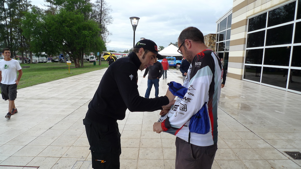 Luego me fui a buscar a Miguel Puertas recientemente ascendido a teniente coronel del ejército del aire y uno de los que lleva a gala los valores de la solidaridad en la carrera y nunca duda en ayudar a otros pilotos. Estaba junto a otro piloto en teoría estrella de Gas Gas que se quedó un poco cortado porque yo le pedía la firma a Miguel y además dedicándole palabras de admiración y respeto y sin embargo pasaba del otro piloto con mas nombre. Fue Miguel quien por no hacerle un feo a su compañero le pasó la camiseta para que la firmara y yo por respeto no pude decir que no quería su firma. Jajajajaja Estoy seguro de que el otro se dio cuenta del detalle.