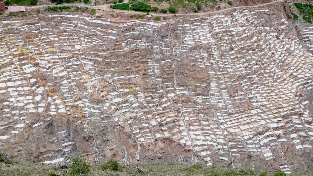 Bajamos para recorrer la parte superior de las bañeras y vimos por dónde manaba el agua salada y los canales por donde repartían el agua a todas ellas. Por lo que nos contó Ángel, ahora en temporada de lluvias está algo más feo porque el agua lo deja todo marrón pero que en la temporada de extracción se ve todo absolutamente blanco.