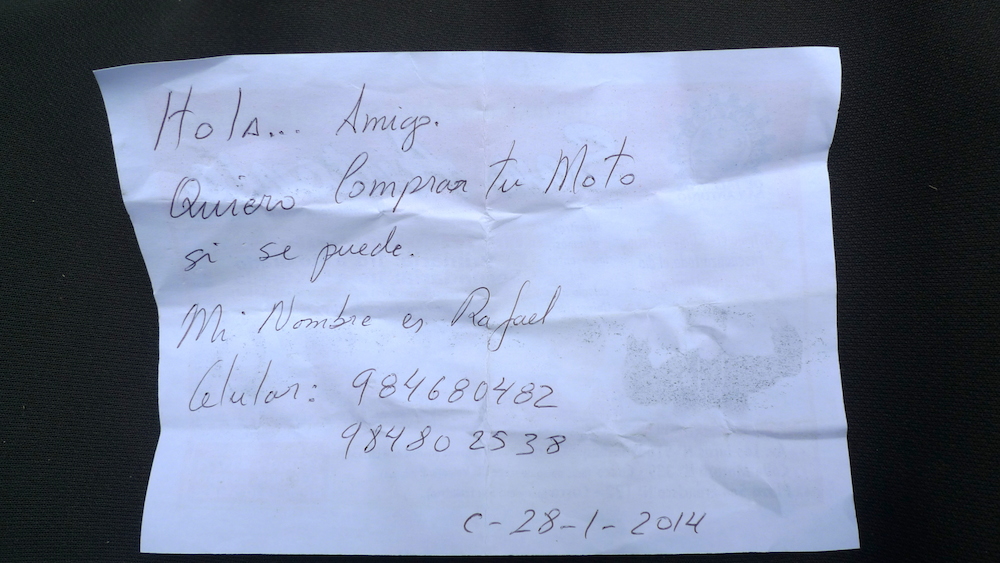 Cuando llegué al aparcamiento me encuentro una nota de papel en el soporte del GPS. Para mi sorpresa era una oferta para comprarme la moto. ¡Qué ilusos! Pensé yo.